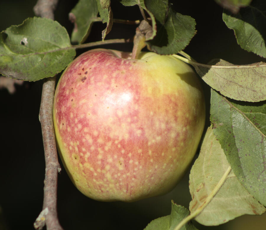 Minnehaha is the first variety of apple introduced by the Minnesota breeding program, receiving its name in 1920. It is a large oblate apple with yellow skin generously coated with dark red. The off-white flesh is described as slightly crisp, moderately juicy, and aromatic, with a balance of sweet and tart. The tree is supposed to be vigorous and productive. Its crop ripens over an extended period, much like one of its parents, Wealthy. While Minnehaha has been overshadowed by newer varieties, historical literature notes it as good to very good quality.